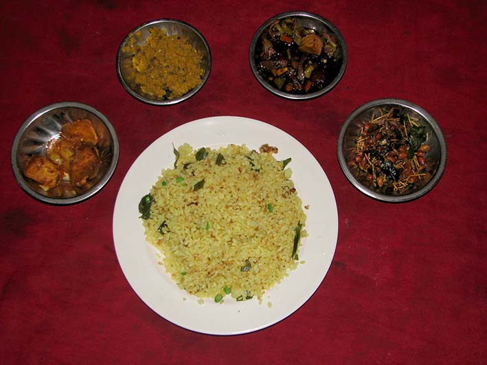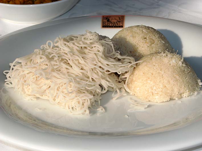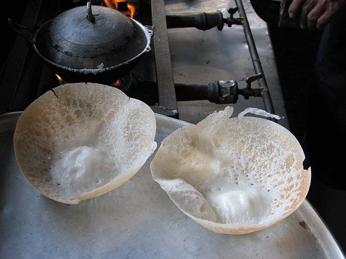 Kadar si nisem želel dneva začeti s pekočim karijem, sem se raje odločil za jed appa (hoopers). To so nekakšne tanke, hrustljave palačinke, pečene v obliki skledic. Maso zanje pripravljajo iz riževe moke, kokosovega mleka in kvasa, lahko pa ji dodajo še malo palmovega vina. Dokaj redko maso vlivajo v majhne globoke ponvice in jo pokrito pečejo na plinskem gorilniku. Pri tem se visoki rob hrustljavo zapeče, debelejše dno pa ostane mehko. Appe odlično teknejo kar same, dobro pa se podajo tudi z jajcem, mlekom ali različnimi kariji. Slednje lahko za zajtrk postrežejo tudi z rezanci iz riževega testa, katere kuhajo v sopari. Imenujejo se indi appa (string hoopers), saj so sestavine za testo podobne kot pri prej omenjeni jedi. Za zajtrk se poda tudi kiribath. To je vrsta mlečnega riža, le da za njegovo pripravo pripravljajo kokosovo mleko. Preden ga postrežejo mu lahko dodajo melasino marmelado ali čili. Iz riža pripravljajo tudi pittu, ki je malajskega izvora. Rižu dodajo sveže nariban kokos in mešanico skuhajo na sopari. Postrežejo ga prelitega s kokosovim mlekom ali s pekočo čilijevo omako. Kruh se na šrilanški jedilni mizi ne znajde prav pogosto. Še najbolj mu je podoben tanek, palačinkam podoben kruh roti. Manjši debelejši kosi lahko vsebujejo pekoče začimbe in kokos. V velike tanke kose pa običajno zavijajo mesne ali zelenjavne nadeve.