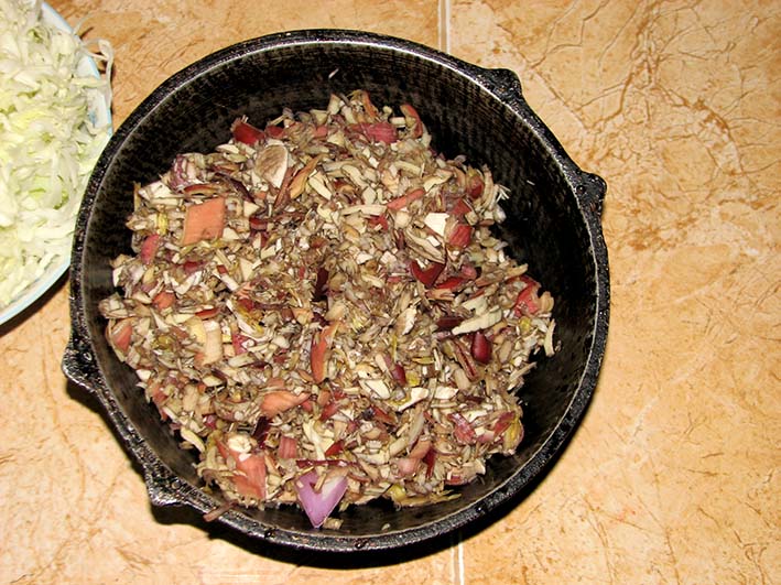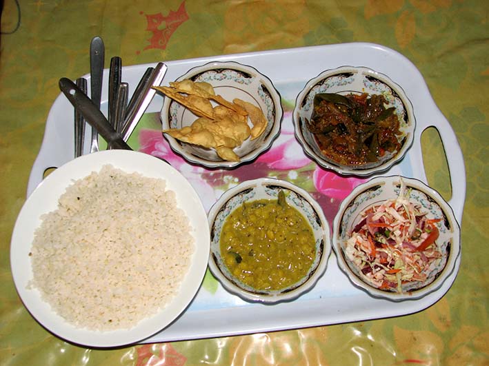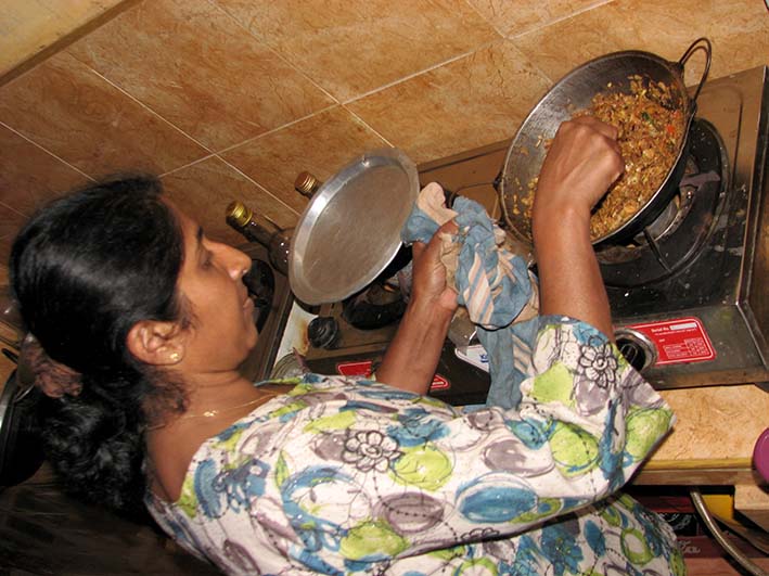 Šrilanške jedi so tako pestre, da je vredno pokukati v katero izmed kuhinj. Najlepša priložnost se mi je ponudila v gorski vasici Ella, kjer domačinka Niranjala Thilakerathne organizira kuharske tečaje. To ji gre dobro od rok, saj že desetletje z odlično hrano razvaja goste v domačem penzionu Sun Top Inn. Kuharske izkušnje izpopolnjuje od rane mladosti, ko se je radovedno sukala v domači kuhinji, kjer sta ustvarjali mama in babica. Njuni recepti še danes živijo v Niranjalinih mojstrovinah, s katerimi razvaja goste. Na nekajurnem kuharskem tečaju seznani ”svoje učence” z več vrstami karijevih jedi, ki jih na otoku običajno postrežejo z različnimi vrstami riža. Za svojo družino običajno pripravi štiri vrste karija, goste pa razvaja vsaj z šestimi. Kadar utegne tudi z ribjim. Slednji zahteva dolgo pripravo in kari običajno pusti stati čez noč, da dobi polnejši okus. Podobno dolgotrajen postopek je tudi priprava karija iz velikega sadeža jakobovca (jack fruit). Ob mojem obisku ni imela časa za dolgotrajno kuho, a lahko sem užival vsaj v nenavadnih sladko-grenkih okusih jakobovca. Skupaj s pedantno kuharico sva pripravila tri vrste karija: najbolj nenavaden je bil pripravljen iz sesekljanih bananinih cvetov (ne najbolj po mojem okusu), najbolj pekoč iz okre, najbolj okusen pa iz leče. Slednja se podobno kot v Indiji tudi tu imenuje dhal, za njeno pripravo pa lahko uporabite Niranjalin recept.