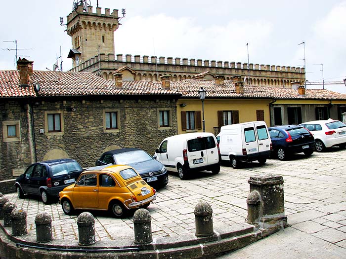 Spletna znanka iz bližnjega obmorskega letovišča Rimini mi je svetovala, da se je v San Marino dobro pripeljati v zgodnih dopoldanskih urah, saj se parkirišča presenetljivo hitro napolnijo prav vse dni v tednu. Še posebno tista, ki se nahajajo pod samim mestnim obzidjem. Ko so ta polna, začenjajo redarji usmerjati promet na nižje ležeča parkirišča. In tista najnižja ležijo res globoko ob vznožju gore Titano, okoli katere se razprostira državica, v celoti obdana z italijanskim ozemljem. K sreči dostop do starega dela prestolnice ni preveč naporen. Z najbolj oddaljenih parkirišč se je mogoče zapeljati z gondolsko žičnico, višje pod starim mestom pa strmine premagujejo panoramska dvigala.